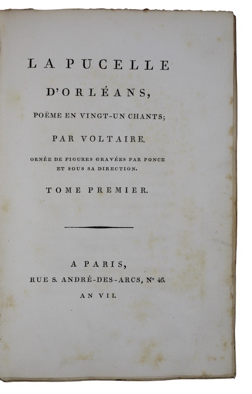 A scarce edition of Voltaire's notoriously bawdy verse parody of the life of French national heroine Joan of Arc, incorporating the risque and erotic plates of the Didot edition of 1795 (though without the borders). First published 1755, it was variously burned, banned and confiscated by governments and religious authorities in Paris, Rome and Geneva.