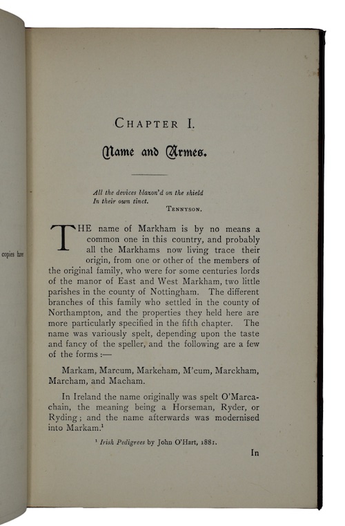 The privately printed sole edition of a genealogy of the Markham family of Northamptonshire by antiquary Christopher Alexander Markham (b. 1859, d. aft. 1903).