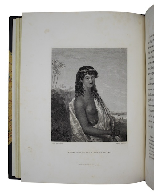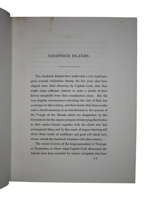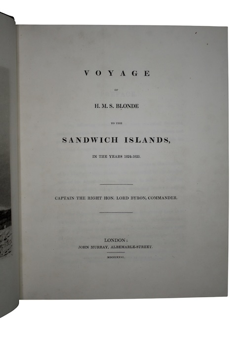 'Kamehameha ll of Hawaii and his queen, Kamamalu, were on a visit to London in 1824 when they both died of the measles, for which they had no immunity. This voyage, with the cousin of the poet Lord George Gordon Byron in command, was undertaken by the British government specifically to return their bodies to the Hawaiian Islands....The work contains a history of the late King's visit to London, a resume of the discovery of and visits to Hawaii by British explorers, as well as the main narrative, compiled by Maria Graham from the journals kept by the naturalist (Bloxam) and from other official papers. The Hawaii portion of the text contains an interesting account of events in Honolulu and travels to Hilo, Kealakekua, and Kailua, Kona'. (Forbes, Hawaiian National Bibliography, 630).