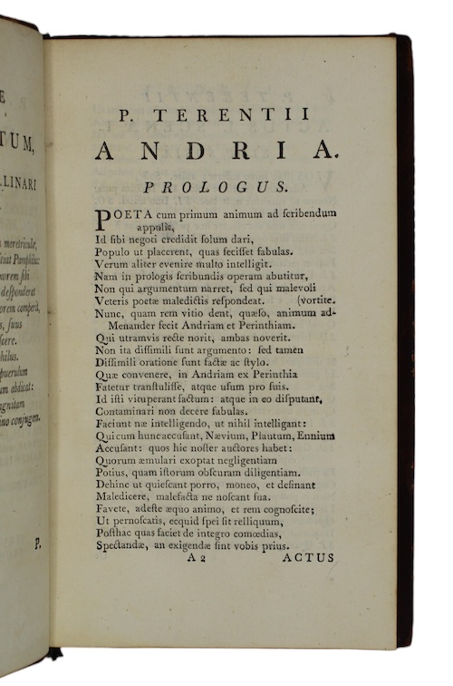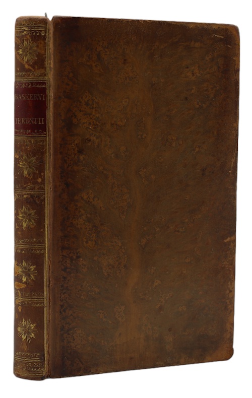 The first Baskerville duodecimo edition of the theatrical comedies of North African playwright of the Roman Republic Publius Terentius Afer (c.195/185-c.159 BCE). This edition contains all six of Terence's surviving plays: Adelphoe (The Brothers), Andria (The Girl from Andros), Eunuchus, Heauton Timorumenos (The Self-Tormentor), Hecyra (The Mother-in-Law), and Phormio.