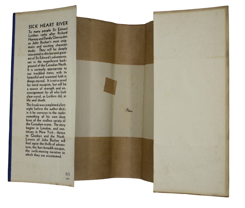 The first edition of John Buchan's last novel, published posthumously. One of Buchan's most spiritual novels, it follows his semi-autobiographical protagonist Sir Edward Leithen - who has appeared in several previous novels - through the Sick Heart River Territory, based on the real Nahanni River in Canada's Northwest Territories.