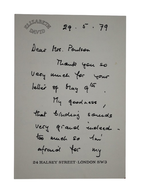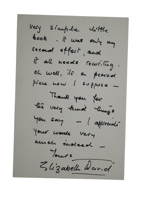 The first edition of Elizabeth David's (1913-1992) culinary classic, together with a typically modest autograph letter.