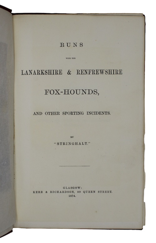 The sole edition of a series of sporting reminiscences, including fox hunting, written originally for the Glasgow Herald and Sporting Gazette.