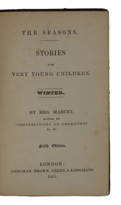 A mixed edition set of salonnière Jane Marcet's [née Haldimand] (bap. 1769, d. 1858) popular stories for young children explanatory of the different objects and events which characterise the seasons, from sliding on ice in winter to reaping the harvest in Autumn.