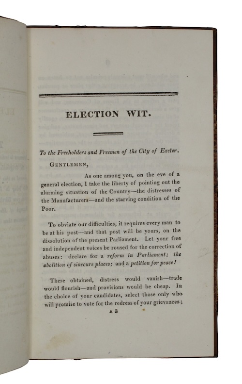 The sole edition of a collection of songs, squibs, and correspondences issued in the 1812 general election campaign in Devon, contested between Tory candidates Edmund Pollexfen Bastard (1784-1838) and Sir Thomas Dyke Acland (1787-1871).