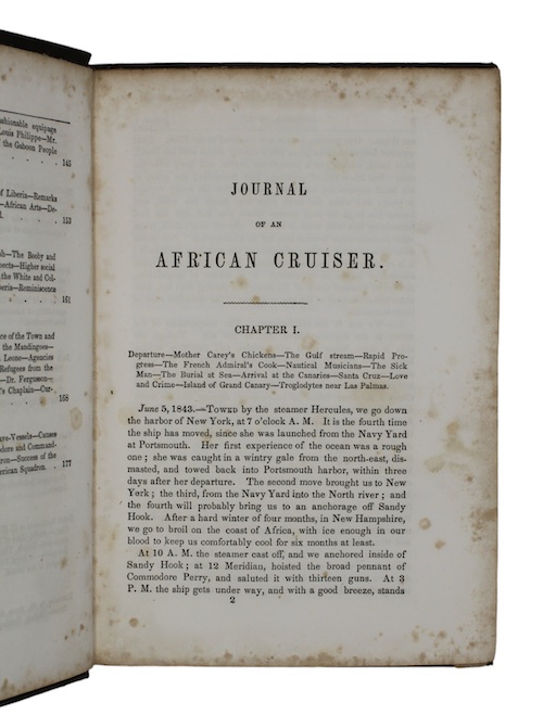 The second edition, printed in the year after the first, of United States Navy office Horatio Bridge's (1806-1893) narrative of his service aboard the USS Saratoga with the mission to curtail the transport of enslaved people from the west coast of Africa aboard American vessels. Bridge was the patron of celebrated novelist Nathaniel Hawthorne (1804-1864) who edited this volume.