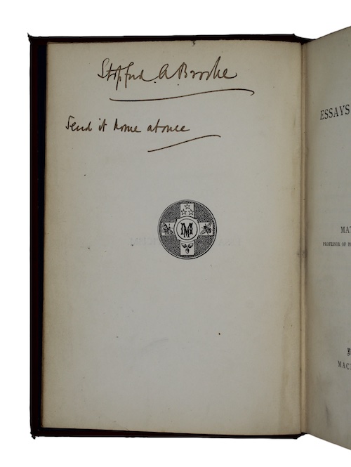 Stopford Brooke's copy of Matthew Arnold's (1822-1888) Essays in Criticism. In his first series of essays, Arnold sought to broaden the scope of English literary criticism by engaging with European literature and philosophy. Brooke's admiration of Arnold was not altogether reciprocated - although Arnold endorsed Brooke's A Primer on English Literature, he was critical of Brooke for confusing periods of literature with periods of history.
