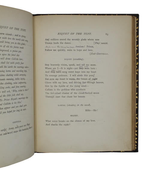 A handsomely bound copy of Stopford Brooke's verse drama Riquet of the Tuft. The drama takes its name from the French literary fairy tale Riquet with the Tuft, telling the story of an ugly prince who is aided by a fairy in marrying a beautiful princess.