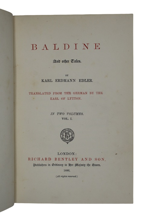 Selected 'specimens of the lighter workmanship' of Karl Erdmann Edler (1844-1931), Austrian poet and novelist, translated by viceroy of India and poet Edward Robert Bulwer-Lytton (1803-1873). Frequently publishing his own verse under the name 'Owen Meredith', Lytton describes Edler's genius as 'psychological and dramatic'.