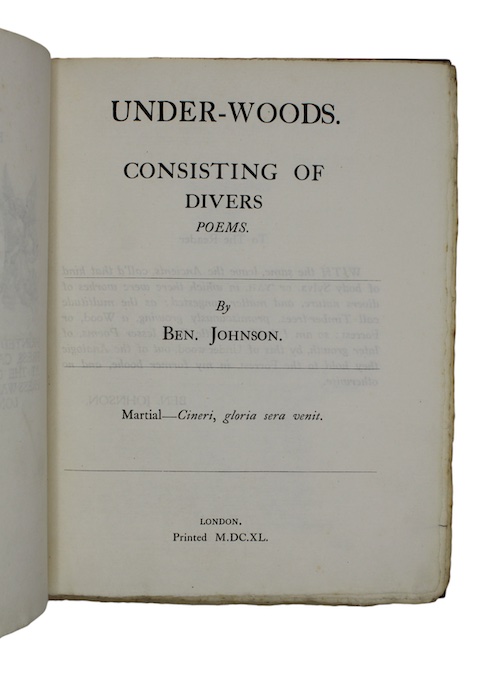 A limited edition of Jonson's Underwoods, a poetry collection first published posthumously as 'The Underwood' in 1640. Jonson described the poems within, written across his career, as 'timber trees promiscuously growing a ‘wood’ or ‘forest’, and so felt 'bold to entitle these lesser poems of later growth by this of ‘underwood’, out of the analogy they hold to The Forest in my former book, and no otherwise'.