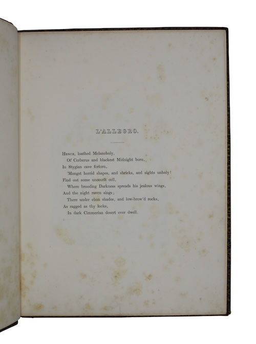 A handsomely bound edition containing Milton's famous pastoral duet, L'allegro and Il Penseroso. Probably composed shortly after Milton's time at Cambridge, the titles of the poems translate to "The Happy Man" and "The Melancholy Man" respectively.