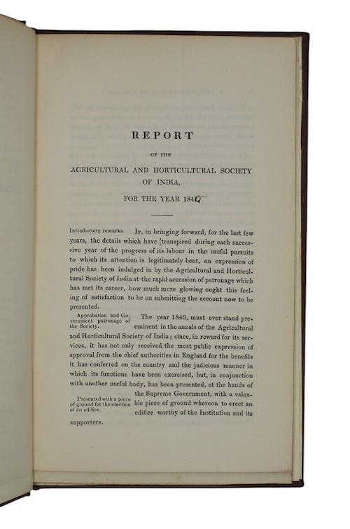 The second located copy of the annual report of the Agricultural & Horticultural Society of India for the year 1840, together with a contemporary list of members, printed at the Baptist Mission Press at Calcutta which operated from 1818 until the 1970s.