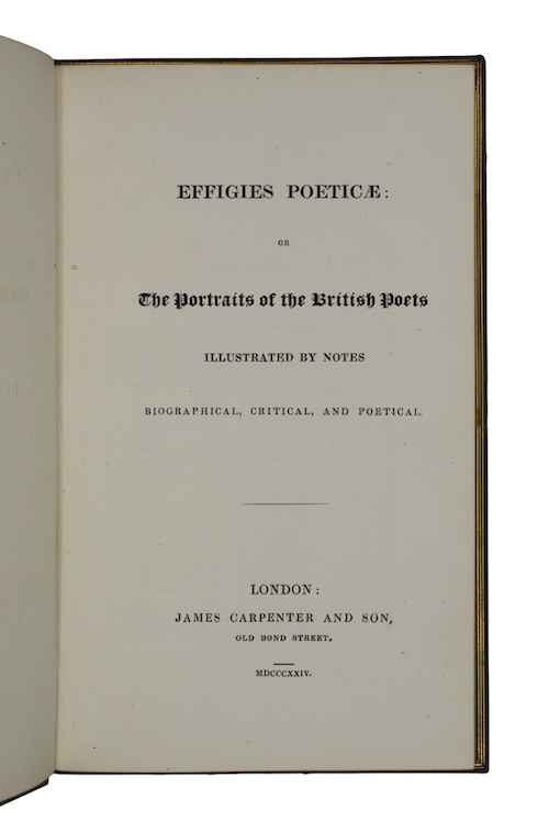 The first edition, elaborately bound, of Bryan Waller Procter's (1787- 1874) letterpress for engraved portraits of one hundred and thirty-eight significant British poets, including, inter alia, Pope, Johnson, Dryden, and Shakespeare.