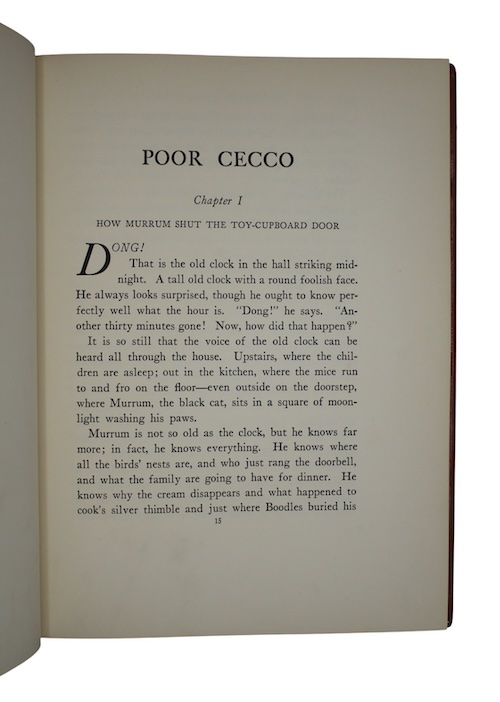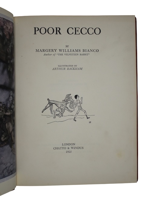 A finely bound first edition of Poor Cecco, a masterful fable by children's author Margery Williams Bianco (1881-1944), creator of the Velveteen Rabbit; Bianco's son, Cecco, gives his name to the titular wooden dog. The colour plates within were illustrated by leading figure of the 'Golden Age' of British book illustration, English artist Arthur Rackham (1867-1939), whose trichomatically-printed pen-and-ink drawings defined the landscape of early twentieth century children's publishing from Grimm's fairy tales to the Wind in the Willows.
