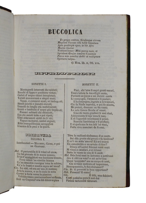 A mid-nineteenth century Sicilian edition of select works by Palermitani poet Giovanni Meli (1740-1815), notably including his first published piece 'La Buccolica'; a long poem inspired by Don Quixote, 'Don Chisciotti e Sanciu Panza'; and 'Odi', an ode in honour of Nelson which Meli purportedly attempted to suppress following the execution of Neapolitan natives on the order of the English officer.