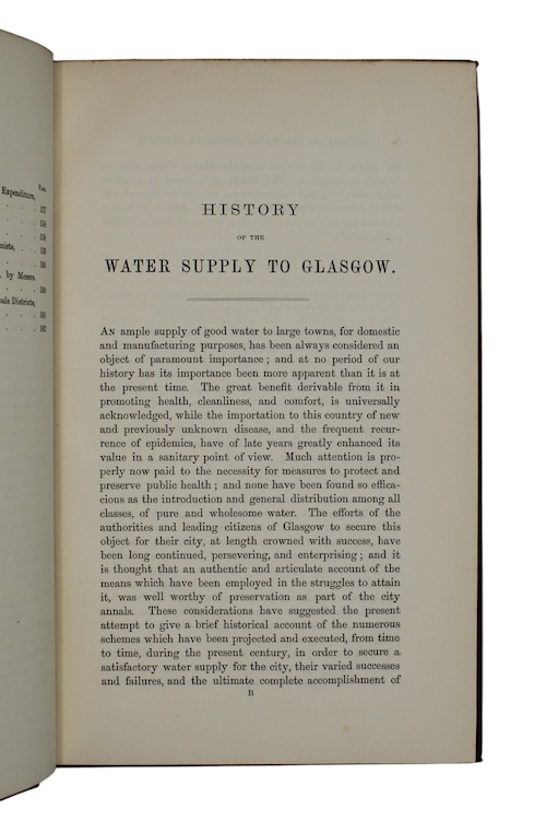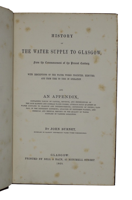 The sole edition of a monograph on the nineteenth century developments made to the water supply to Glasgow - in particular the construction of an aqueduct at Loch Katrine commenced in 1855 to prevent further cholera outbreaks in the city - by John Burnet, secretary to the Glasgow Corporation Water Works Commissioners.