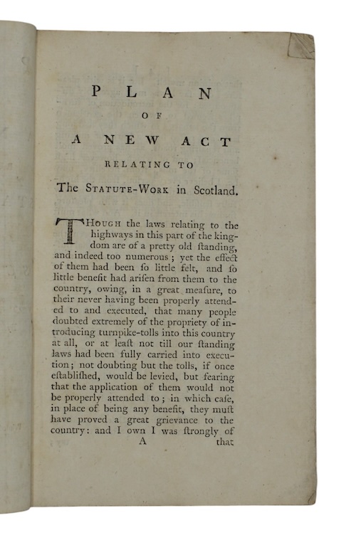 A rare survival, in original state, of an anonymous pamphlet supporting the introduction of the 1773 Turnpike Act; specifically, the benefits to road maintenance afforded by introduction of unpaid labour legislation.