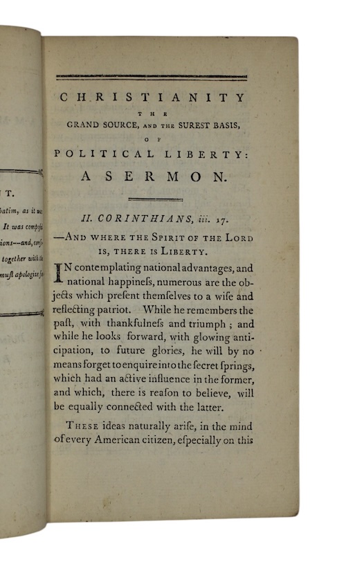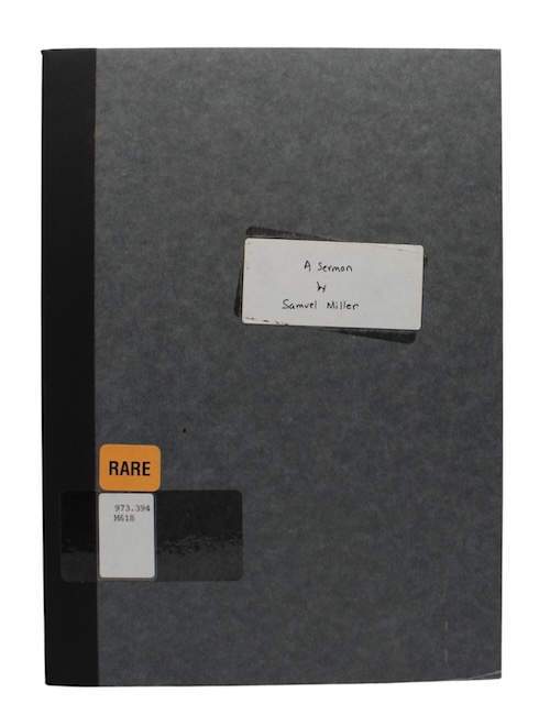 The first edition of a sermon preached in 1793 by Presbyterian theologian Samuel Miller (1769-1850), professor at Princeton Theological Seminary, at the request of Tammany Hall, the primary local Democratic pressure group and a major authority over New York state politics. Miller's address, preached on Independence Day, addressed the ongoing, and divisive, French Revolution, questioning, in support of the revolt: 'Can we turn our eyes to the European states and kingdoms—can we behold their convulsive struggles, without considering them as all tending to hasten this heavenly aera?'