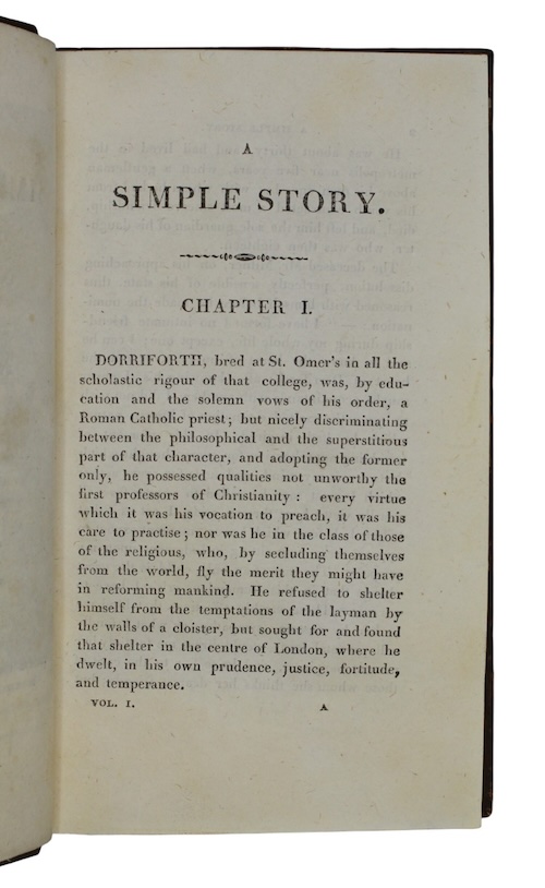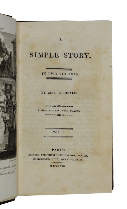 The first novel by English actress and dramatist Elizabeth Inchbald (1753-1821), described as a 'story of passion', the narrative touches on themes as broad as women's education, Catholicism, and sensibility. Inchbald, whose moderately successful acting career involved overcoming a stammer in the face of a disapproving family, utilised theatrical aspects in her literary works such as tableau and gesture, often with the aim of defying logocentric convention.