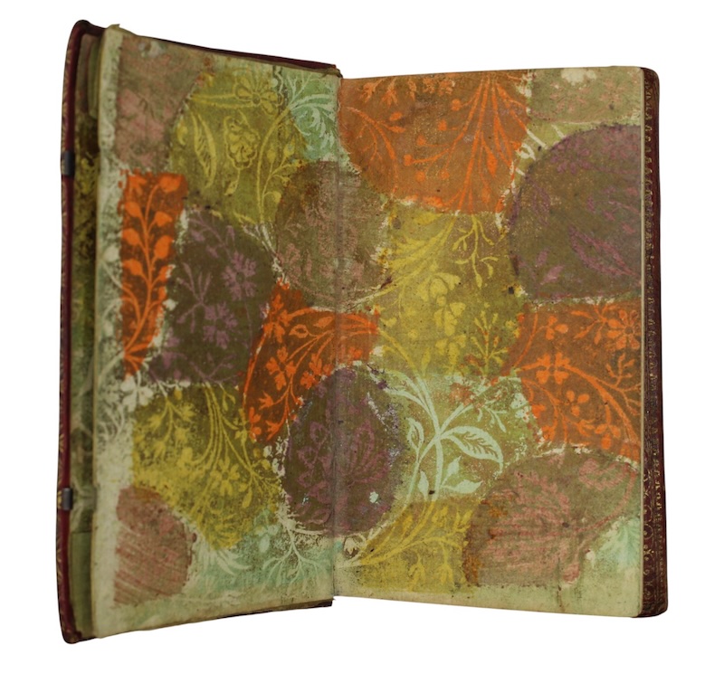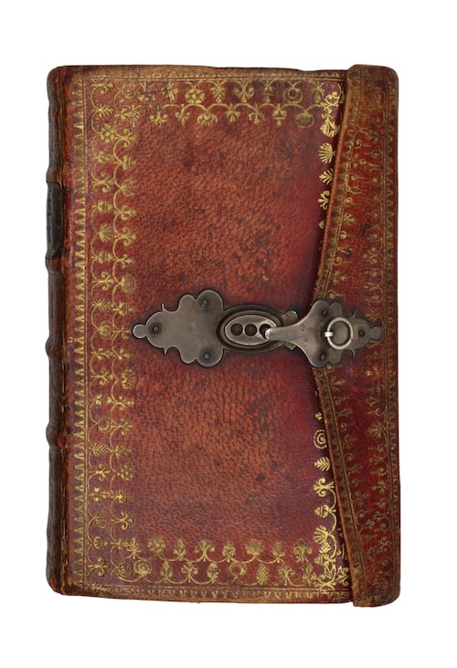 12mo. Attractively bound in contemporary richly gilt-tooled red morocco wallet style binding, fastened with metal clasp, contrasting black morocco lettering-piece lettered 'Amey's List', A.E.G., 'Dutch' floral endpapers, pockets to front and rear. Lightly rubbed, dulled, later repair to foot of flap at hinge, lower green silk hinge of front pocket split, hinges of rear pocket perished, very occasional pencilled notes to interleaves blanks.