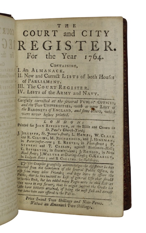 A sumptuously bound mid-eighteenth-century almanac, combining the ever-popular Court and City Register, which had once been published by R. Amey and consequently was in some quarters still referred to as 'Amey's List', with Cardinus Rider's perennial British Merlin.