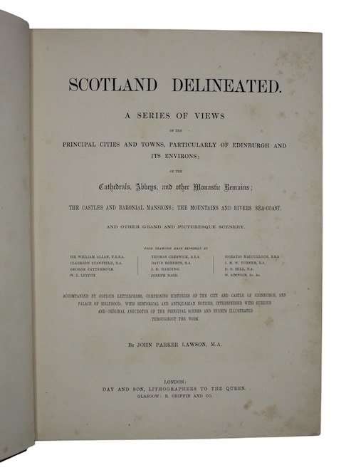 A richly illustrated volume of Scottish landscapes compiled by minister of the Episcopal Church of Scotland John Parker Lawson (died 1852). The drawings within, commissioned by original publisher Joseph Hogarth, were provided by many of Britain's pre-eminent landscape artists, among them Joseph Nash and J.D. Harding. Lawson spent his time in Edinburgh writing for booksellers, developing a talent for historical writing, particularly on Episcopal, Catholic and Scottish histories, which was applied diligently in the captions to this volume.