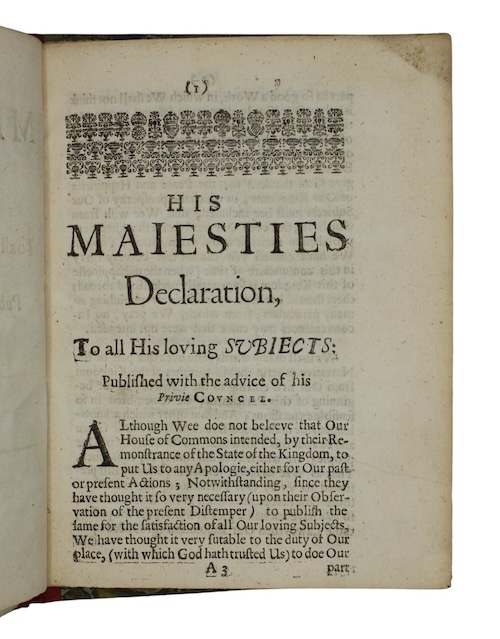 The first edition of the response of Charles I to the House of Commons passing of the Grand Remonstrance; a petition documenting the many and varied objections to his domestic, foreign and religious policy, in vivid detail, held by his critics in Parliament.
