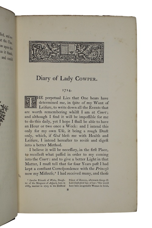The witty and revealing diary of Mary, Countess Cowper (1685-1724), Lady of the Bedchamber to Caroline, Princess of Wales, and wife of William Cowper. Fluent in French, Mary Cowper used her position in court to influence the Princess's political thought - on her first day in attendance, she delivered to Her Majesty Bernstorff’s 'A Treatise on the State of Parties' which she 'had transcribed and translated for my Lord, in French and English, to give the King'.