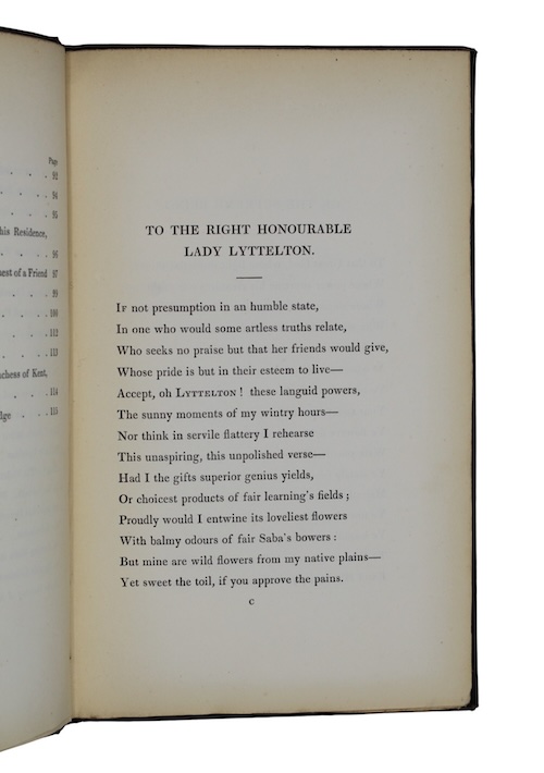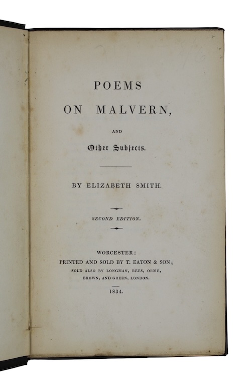 The only volume of poetry published by Elizabeth Smith, of whom little is known. It is speculated that she is buried at the church of St. Mary and St. Michael, Great Malvern, and may have been born in the nearby village of Upton on Severn around 1790. The volume contains a dedicatory poem addressed to local benefactress Lady Lyttelton, or Sarah (Spencer) Lyttelton (1787-1870), of whom Smith may have been a contemporary.