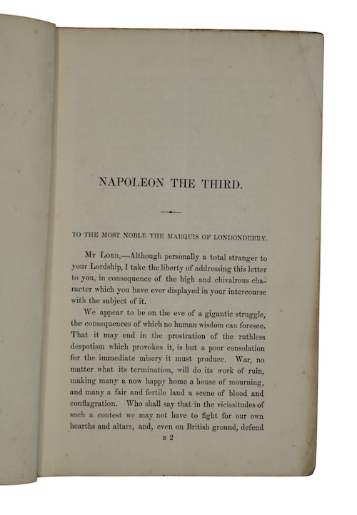 An anonymously published sketch of the character of Napoleon III, Emperor of France, by Irish barrister Charles Phillips (1787?-1859), delivered in the form of a satirical elegy. A strong supporter of Catholic emancipation, Phillips' 'florid' rhetorical style earned him ire from the bar, but credence with the jury.