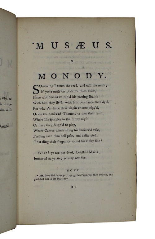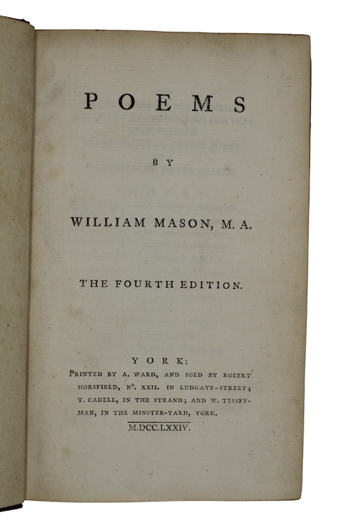 The fourth edition of the collected poems of William Mason (1725- 1797), including his first widely praised composition, 'Musaeus: a Monody to the Memory of Mr Pope' (1774). Mason later achieved recognition for a biography of his friend, poet Thomas Gray, which inspired James Boswell to undertake a similar approach in his Life of Samuel Johnson (1791).