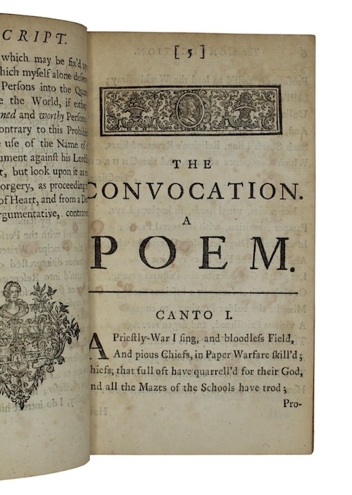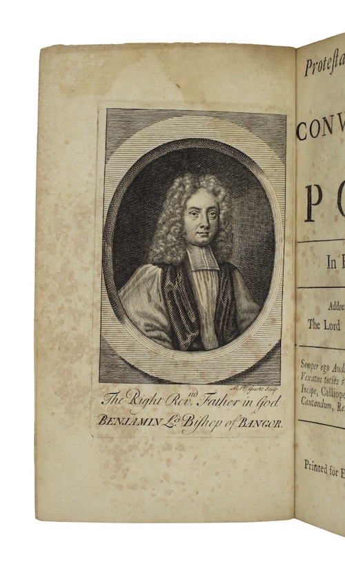 The first edition of a eulogy on Benjamin Hoadly, Bishop of Bangor, by English whig poet Nicholas Amhurst (1697 – 1742). Written as a student of the University of Oxford, from which he was shortly expelled for his political leanings, Amhurst's verse invoked imagery of Catholic heresy to accuse the established church of corruption and Popery.