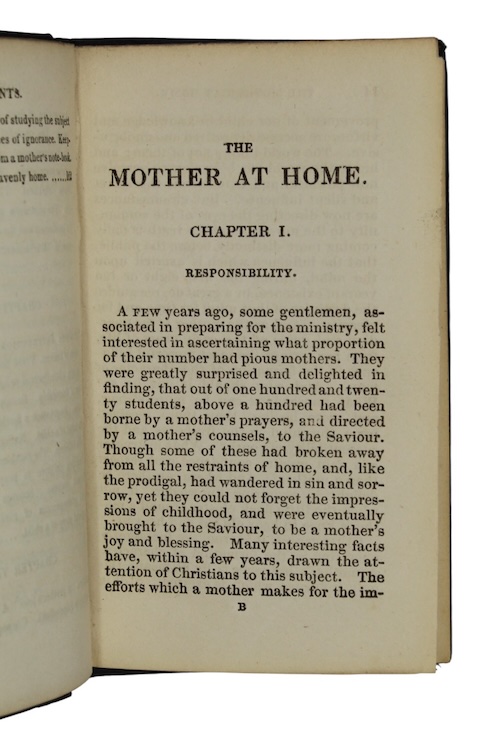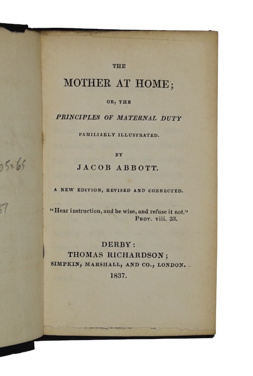 The debut of American historian John Stevens Cabot Abbott (1805-1877), brother of children's author Jacob Abbott, under whose name the volume was seemingly published. Dedicated to 'those mothers in Britain who are anxious to unite wholesome discipline, on Christian principles, with the mental improvement of their children', the educational vade mecum was enormously successful, inspiring Abbott to dedicate the remainder of his life to literary pursuits. In particular, his copious publications on popular history are credited with inspiring a growing historical interest in the American public. Among his most famous works were his History of the Civil War in America (1863-1866), History of Napoleon III Emperor of the French (1868), and The History of Frederick II, Called Frederick the Great (New York, 1871).