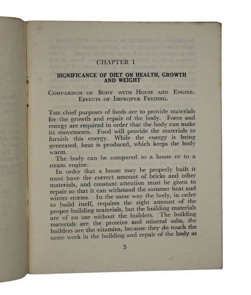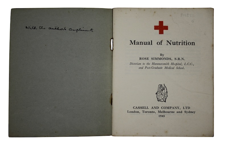 A presentation copy, inscribed and corrected by the author, of a manual on nutrition by Rose Murlis Simmonds, pioneering nurse and first vice- President of the British Dietetic Association. Decorated with the Royal Red Cross for her service in France during the Great War, her handbooks and manuals of dietetics introduced ideas as pivotal as weighing food for diabetic patients; her lectures called for the expansion of the teaching of diet therapy in hospitals, creation of diet kitchens, and recycling of food waste to feed hungry patients. Her legacy is remembered today through the British Dietetic Association's most prestigious award, to which she gave her name.