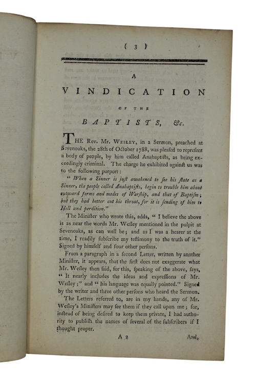 The third edition of a short tract defending the Baptist movement against the 'charges' of Methodist leader John Wesley, written by Unitarian General Baptist William Kingston (c.1749-1812), of Barton Mills, Kent. Kingston's quarrel stems from a sermon preached by Wesley on the 28th of October, 1788, in which he alleged that when 'a sinner is just awakened to see his state as a Sinner, the people called Anabaptists, begin to trouble him about outward forms and modes of Worship, and that of Baptism; but they had better cut his throat, for it is sending of him to Hell and perdition'; the Baptist's response accuses the Methodists of adopting the unfaithful and undecided into their ranks, and emphasises the declarative certainty of Baptism in establishing Christian faith.