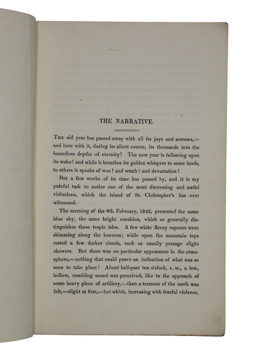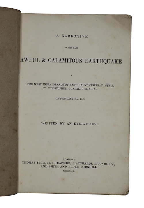 An atmospheric account the 'havoc and devastations' caused by the 1843 Guadeloupe earthquake - the strongest then recorded in the Lesser Antilles - composed by an anonymous eyewitness in St. Kitts. Further accounts of the impact on the islands of St. Eustatia, Nevis, Montserrat and Antigua, the latter of which were visited by the author in the days following the disaster. Comprehensive details of the impact on the islands' civil, military and commercial infrastructure - including many named sugar plantations - feature throughout. The estimated cost of damage at the docks in Antigua alone are reported at '£20,000 to £30,000'. Reassuringly for bibliophiles, despite the tales of general woe and numerous deaths which occurred, it is noted that whilst the 'Antigua library is also greatly dilapidated; half of it is down', the 'superior collection of books are fortunately saved'.
