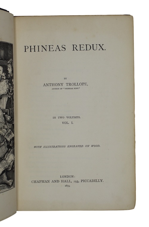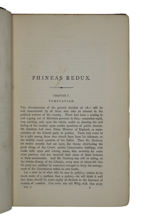 The first edition, in original cloth, of the sequel to Trollope's landmark political novel Phineas Finn (1869), which serves as the fourth of his 'Palliser', or parliamentary, series. Following the character of the eponymous Whig politician, Phineas Redux was first published as a serial between 1873-74 in The Graphic; unusually pro-Irish for Victorian novels, the work draws from Trollope's own experiences running as a Liberal MP in the Parliamentary election for Beverley, in which he ultimately finished last.
