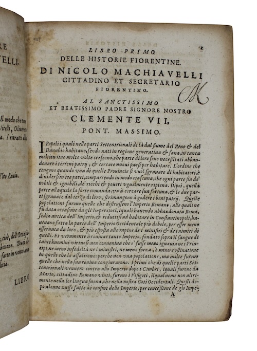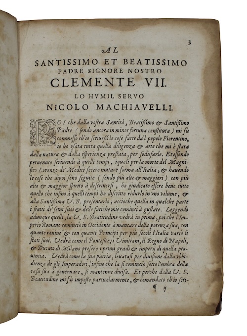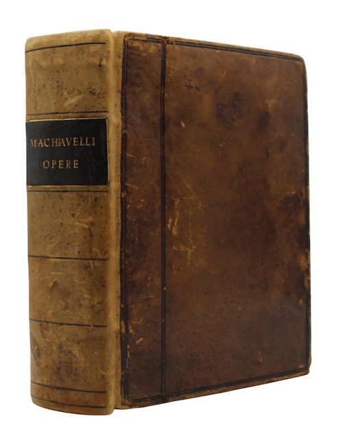 The fourth of five variants of the early seventeenth-century 'Testina' reissue of the 1550 edition of the complete published works, in the original Italian, of Renaissance polymath and political philosopher Niccolo Machiavelli (1469-1527).