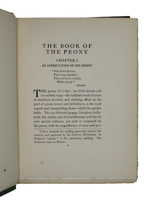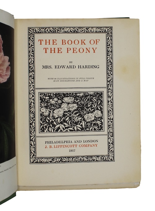 The first book on peonies, preceding Peonies in the Little Garden (1923), by American horticulturalist Alice Harding (1871-1938), who established and tended the gardens at Burnley Farm in Plainfield, New Jersey.