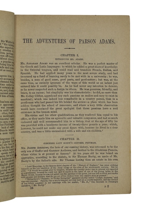 An apparently unrecorded abridged edition of a portion of Henry Fielding's (1707-1754) second published prose work, the novel Joseph Andrews (1742), edited by journalist William Thomas Stead (1849-1912); number 55 in the "Review of Review's" Masterpiece Library, Penny Popular Novels series.