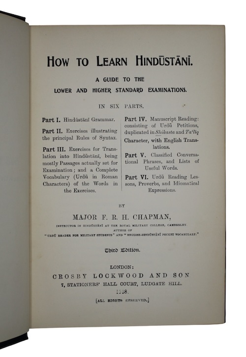 The third edition of a new learner's guide to the historic Hindūstānī language by Major Francis Robert Henry Chapman (1858-1942), British Colonial Officer in India, and author of an English-Hindūstānī Pocket Vocabulary (Containing 1500 Useful Words in Classified Lists) (1904).