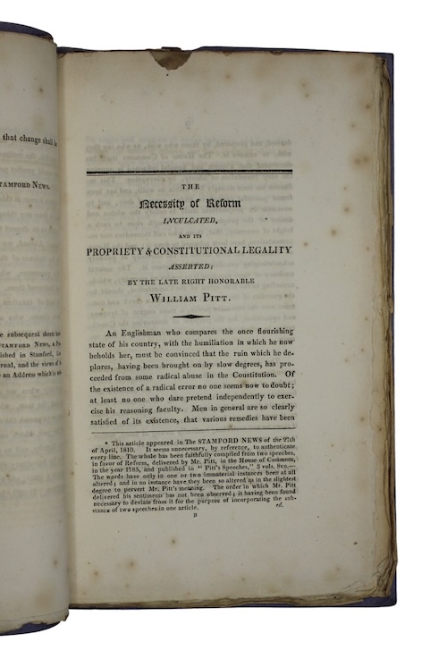 The very scarce first edition of a collection of pieces first published in Drakard’s Stamford News in early 1810. John Drakard, (1774/5-1854) publisher and radical, used his weekly Stamford News, established in 1809, to distribute articles in favour of reform. Drakard was often prosecuted for libel, most notably for publishing an article criticising corporal punishment in the British Army, entitled 'One Thousand Lashes', for which he was sentenced to eighteen months in jail, and fined £200. The extracts compiled within this volume contain vitriolic criticism of future Lord Chancellor Charles Yorke, (1764-1834) protesting his opposition to reform, anti-Jacobinism, and his acceptance of a sinecure as Teller of the Exchequer, with a salary of £2700 a year.