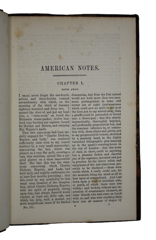 The first cheap edition, originally published in three volumes in 1842. The account of Dickens' experience in America was highly controversial, with Dickens bibliographer John Eckel noting that 'Not one of Dickens' books was the subject of so much adverse critcism as the book he wrote after his return from America in 1842'.