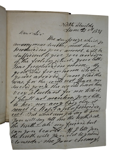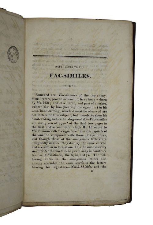 The sole edition of an account of the case of Thomas Hill, a Methodist minister in North Shields accused of libelling a member of his congregation, which led to trials in Newcastle and York, and became a local cause célèbre. Hill was accused of having sent letters to the fiancé of Jane Bell that cast sufficient doubt on her probity as to cause him to break off their engagement. Over the course of the trials, many witnesses spoke on Bell’s behalf, including many Methodist tradesmen; this account is differentiated through its inclusion of facsimiles of Hill’s letters, which were used to demonstrate that they were indeed the work of his hand.