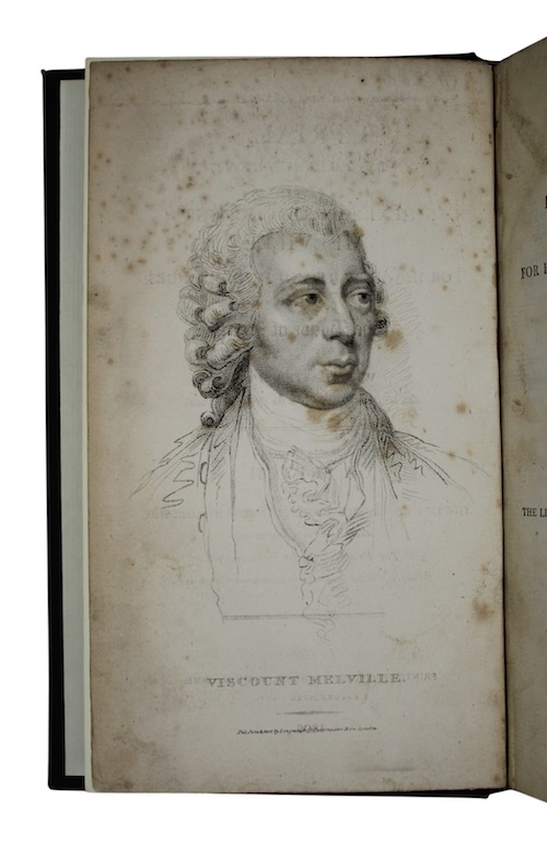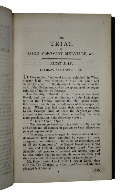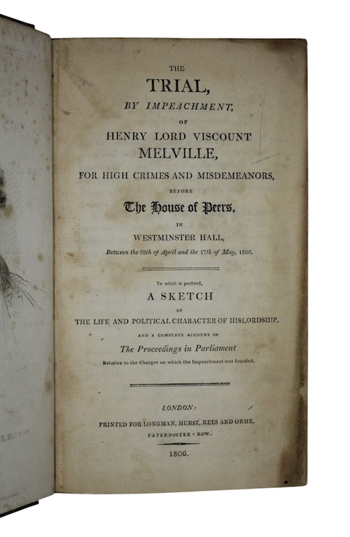 The first edition of this report of the last impeachment trial to be held in the House of Lords. The defendant, Henry Dundas, 1st Viscount Melville (1742 – 1811), was accused of embezzling government funds during his appointment as treasurer of the admiralty between 1782 and 1800. Despite being acquitted, the trial lost Dundas a great degree of public favour, partially sullying his legacy as Home Secretary, Lord Advocate, Secretary of State for War, and First Lord of the Admiralty.