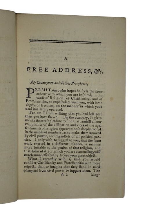 The first edition of Joseph Priestley's (1733-1804) defence of the limited freedoms recently granted to Catholics, adhering to his controversial principles of religious tolerance despite his own aversion to Catholic beliefs. The tract concludes with the famous 'parable against persecution’ by Benjamin Franklin.