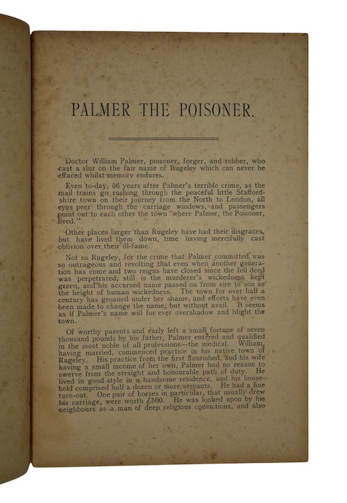 The sole edition, published in Manchester, of a sensational account of the activities of Staffordshire doctor and murderer William Palmer (1824-1856), dubbed the Rugeley Poisoner, or the Prince of Poisoners, after he was charged with the strychnine poisoning of his friend John Cook. Palmer was suspected of poisoning not only Cook, but also his brother, mother-in-law, and four of his own children, for which he collected substantial sums in inheritance and life insurance.
