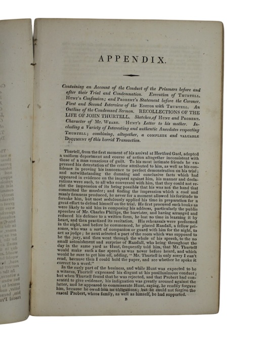 A popular report on the trial of boxer John Thurtell (1793 – 1824) by journalist and popular writer Pierce Egan (1772–1849), famed for his enormously successful journal, Life in London (1821-1828). Such was his fame that even his subject Thurtell, convicted of the brutal murder of solicitor William Weare, reportedly desired to read Egan's coverage of a recent prizefight as he sat in Death Row.