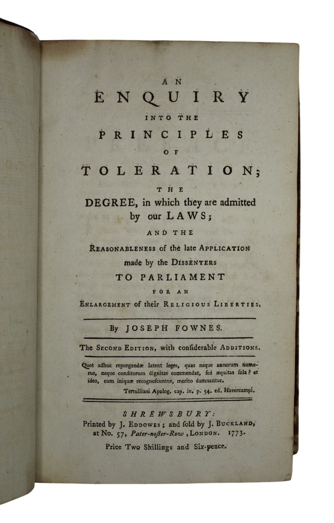 [Bound with:] [HEYWOOD, Samuel]. The right of protestant dissenters to a compleat toleration, asserted... London. Printed for J. Johnson, 1787. First edition. [8], 228pp. ESTC T4880.