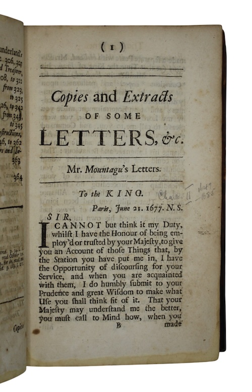 The first edition of a collection of correspondence to and from Thomas Osborne (1631-1712), published by Osborne himself with intent to disprove the steadily spiralling allegations of French allegiance levied at him in parliament during his fall from grace.